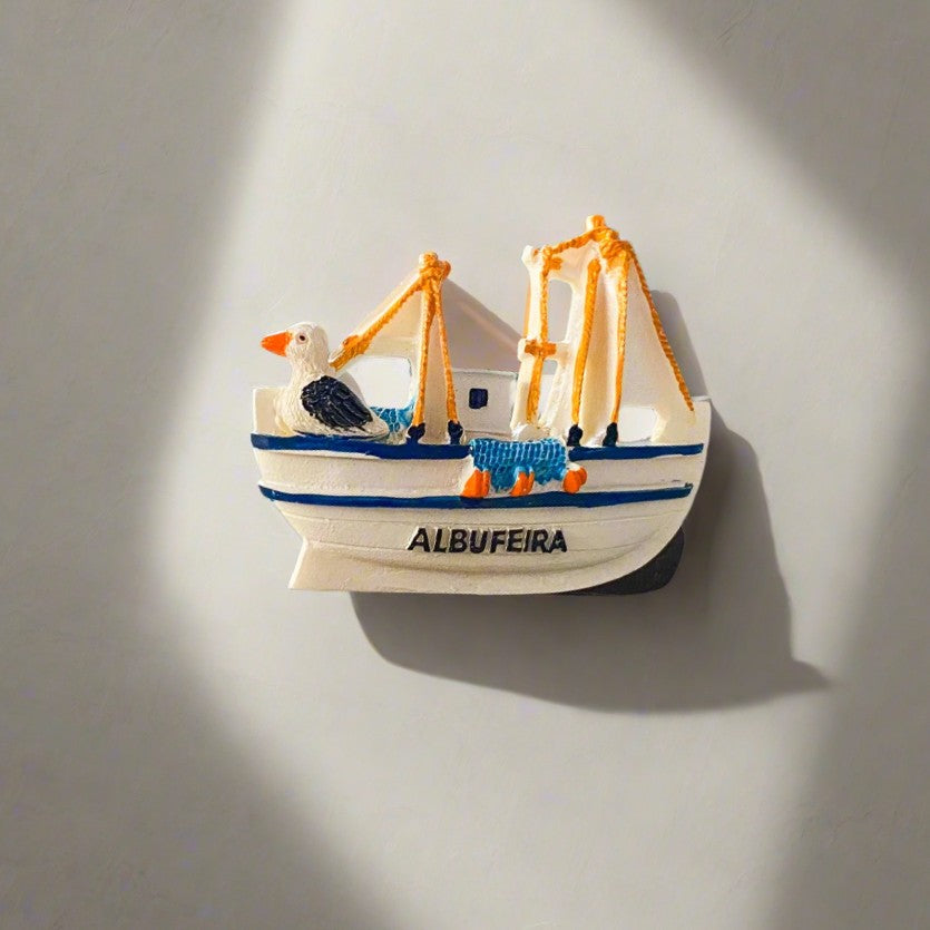 Das Boot ist in klassischem Weiß und Blau bemalt, mit leuchtend gelben Seilen, orangen Schwimmern und einem Netzdetail, das dem Design Bewegung und Zweck verleiht. Eine kleine Möwe sitzt stolz am Bug und erinnert uns an Morgen im Hafen und den Rhythmus des Küstenlebens. Das Wort „Albufeira“ ist deutlich auf dem Rumpf zu sehen und verankert dieses souvenir in einer der ikonischsten Küstenstädte der Algarve.