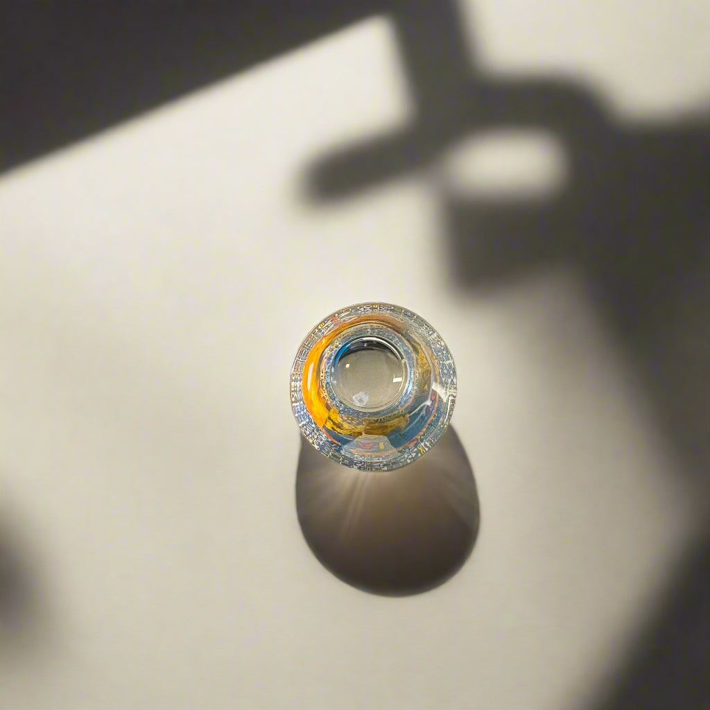 Der Hintergrund aus traditionellen blauen Azulejos verleiht dem Objekt eine zusätzliche portugiesische Note. Diese ornamental verzierten Fliesen – historisch vom maurischen Stil beeinflusst – sind in ganz Portugal zu finden, insbesondere in der Algarve, wo sie Fassaden und Innenräume zieren. Mit einer Farbkombination aus Blau- und Gelbtönen dient dieses Glas als visuelle Hommage an Portugals kunsthandwerkliches Erbe.