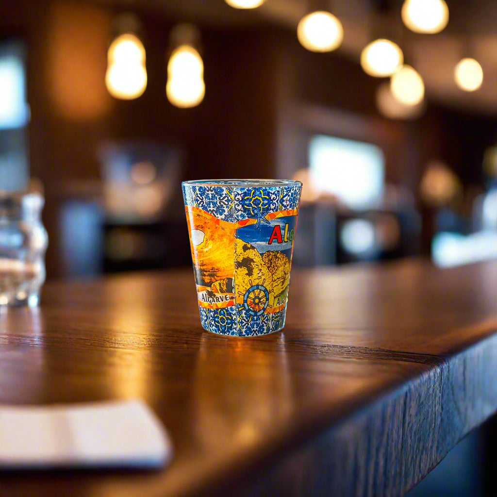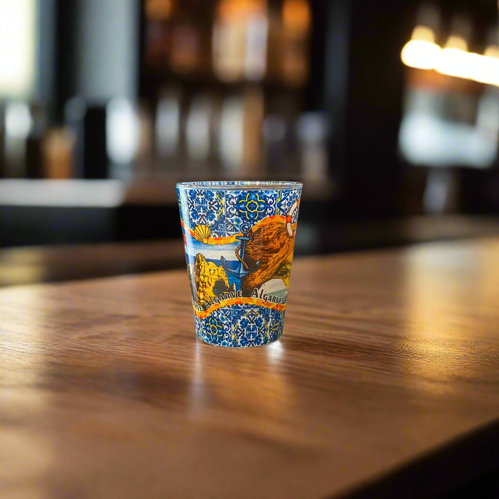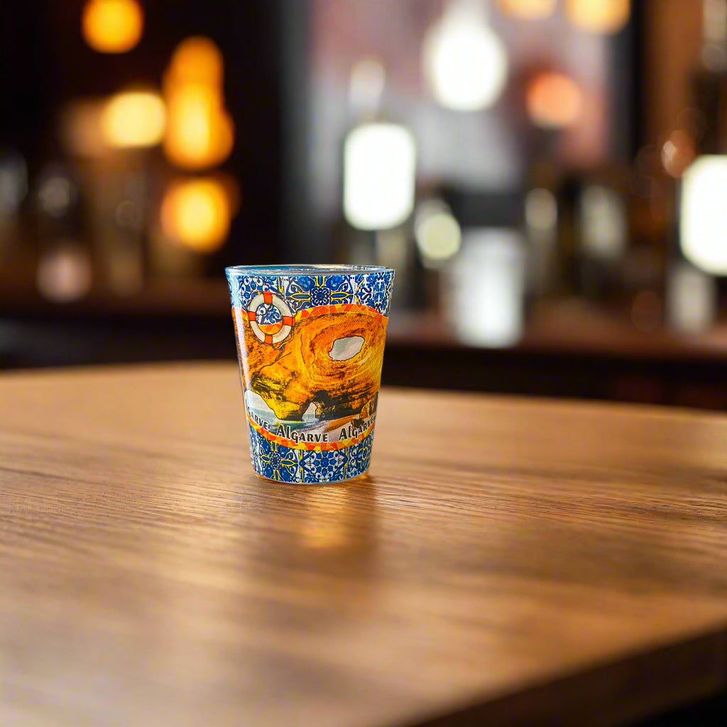 Die Algarve zählt zu den beliebtesten Regionen Portugals – bekannt für goldene Strände, dramatische Steilküsten und historische Fischerdörfer. Von den rötlichen Felsen von Ponta da Piedade bis zu den weiß getünchten Städten wie Lagos oder Tavira spiegelt die Algarve eine Landschaft wider, die Natur und kulturelles Erbe vereint. Dieses Shotglas bringt diese Erinnerungen mit lebendigen Motiven zum Leben und fängt die sonnige, einladende Atmosphäre der Region ein.
