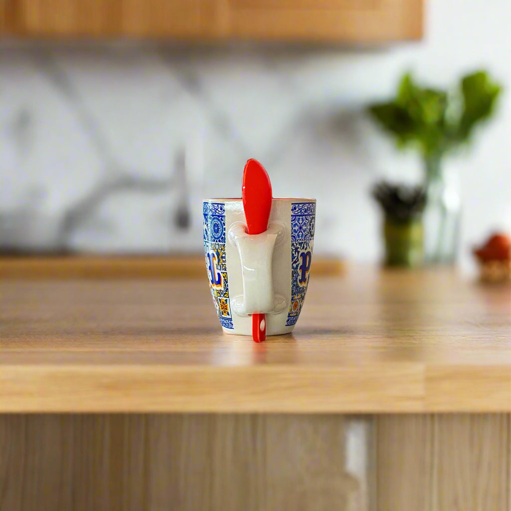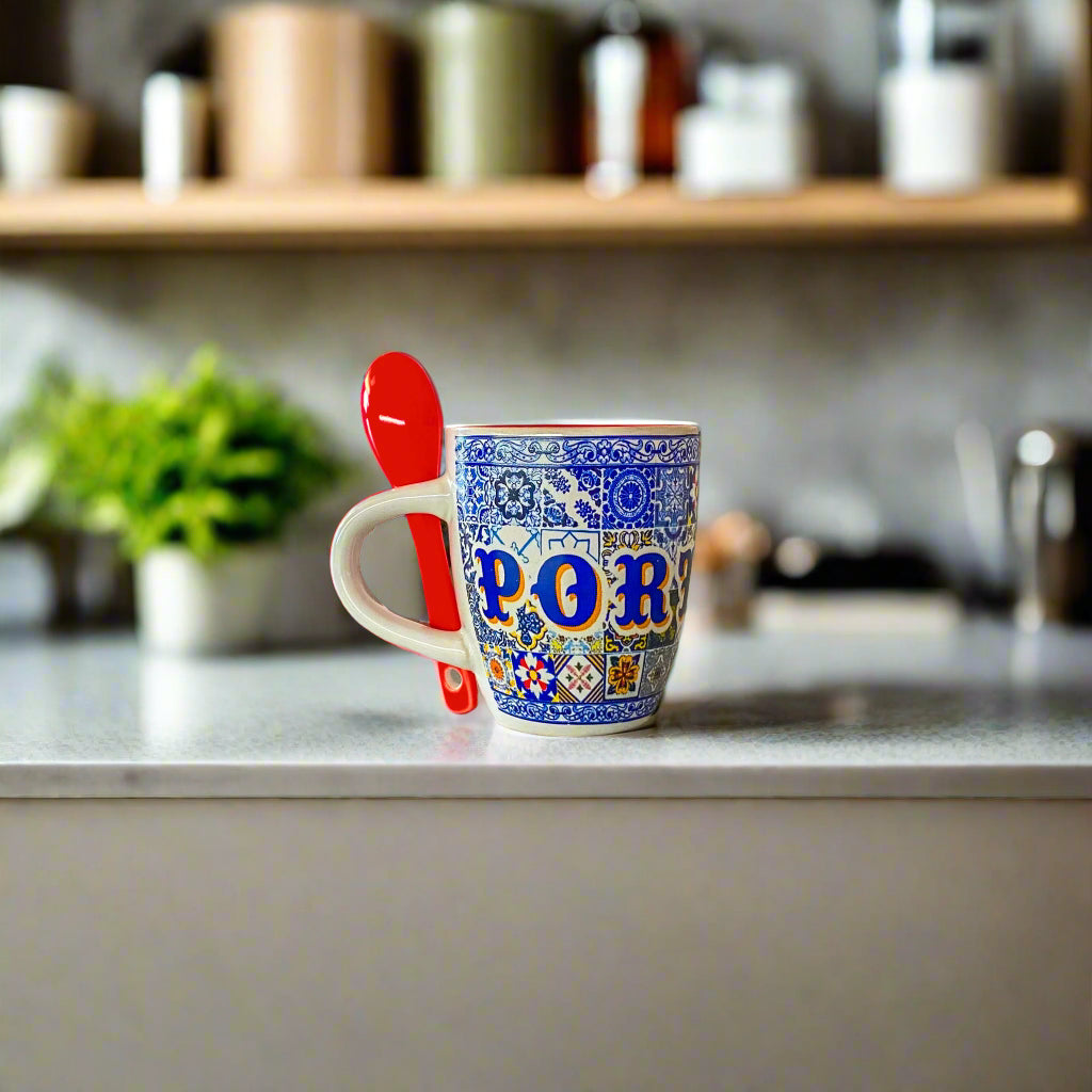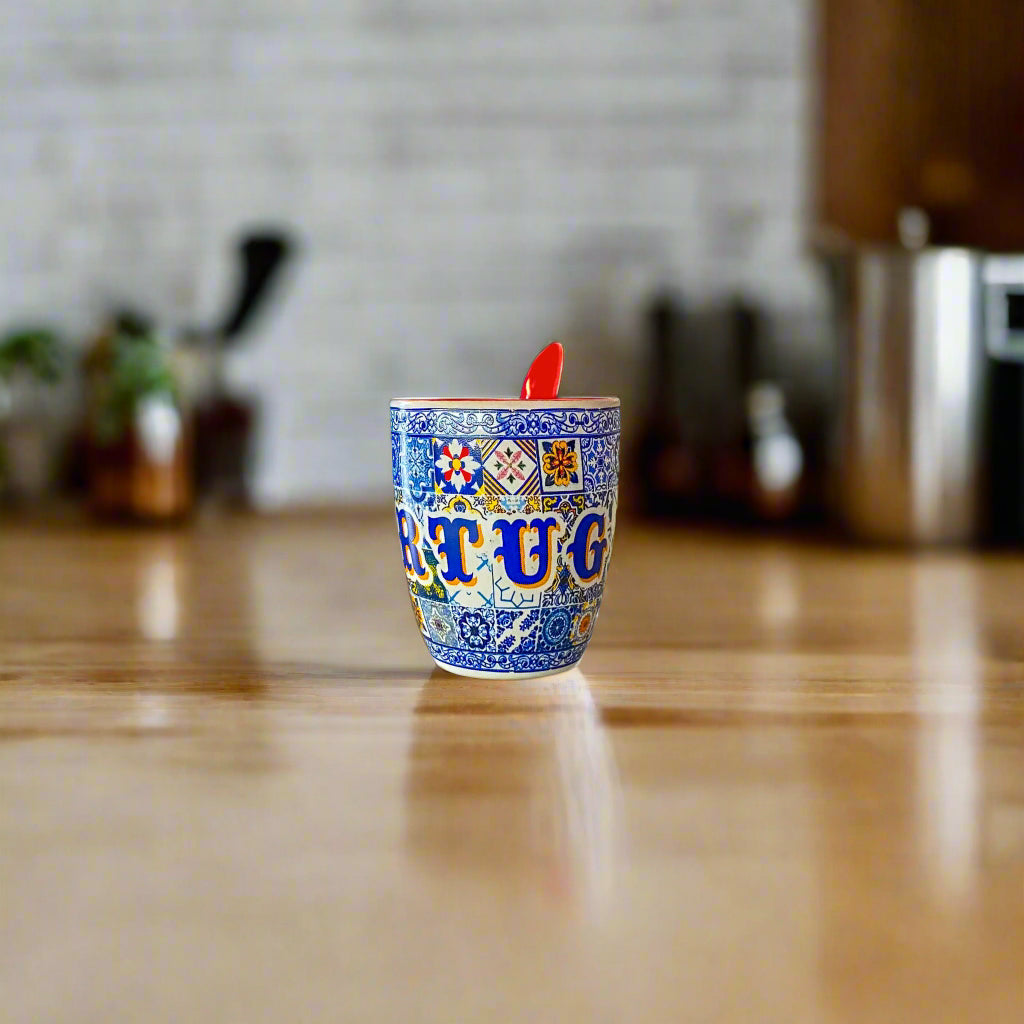 Diese kunstvoll gefertigte portugiesische Espresso-Tasse ist eine Hommage an portugiesische Tradition und Handwerkskunst. Hergestellt aus hochwertiger Keramik, zeigt die Tasse ein elegantes Design, das von den ikonischen blauen und weißen Azulejos – Portugals berühmten Fliesen – inspiriert ist. Das Wort „Portugal“ ist auf dem gemusterten Hintergrund prominent platziert und fängt bei jedem Schluck Nationalstolz ein. Eine leuchtend rote Keramiklöffel ist im Griff integriert – charmant und praktisch zugleich.