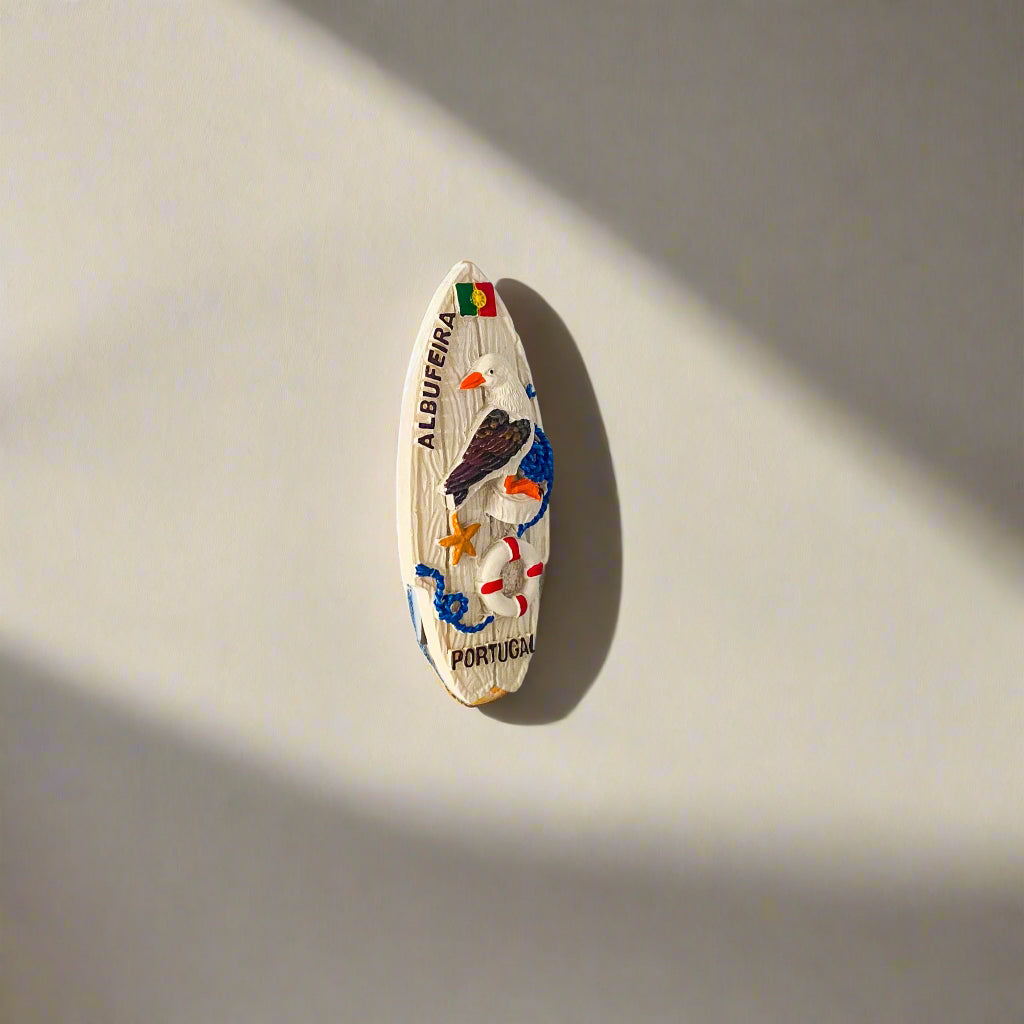 Fangen Sie die entspannte, sonnenverwöhnte Essenz von Albufeira mit diesem originalen surfbrettförmigen souvenir Magneten ein, eine wahre Feier der südlichen Küste Portugals und ihrer tiefen Verbindung zum Meer. Perfekt dimensioniert und detailreich, vereint dieses einzigartige Stück eine Möwe, einen Rettungsring, einen Seestern, einen Oktopusarm und die Nationalflagge – alle Elemente, die die Küstenenergie dieses ikonischen Algarve-Ziels widerspiegeln.
