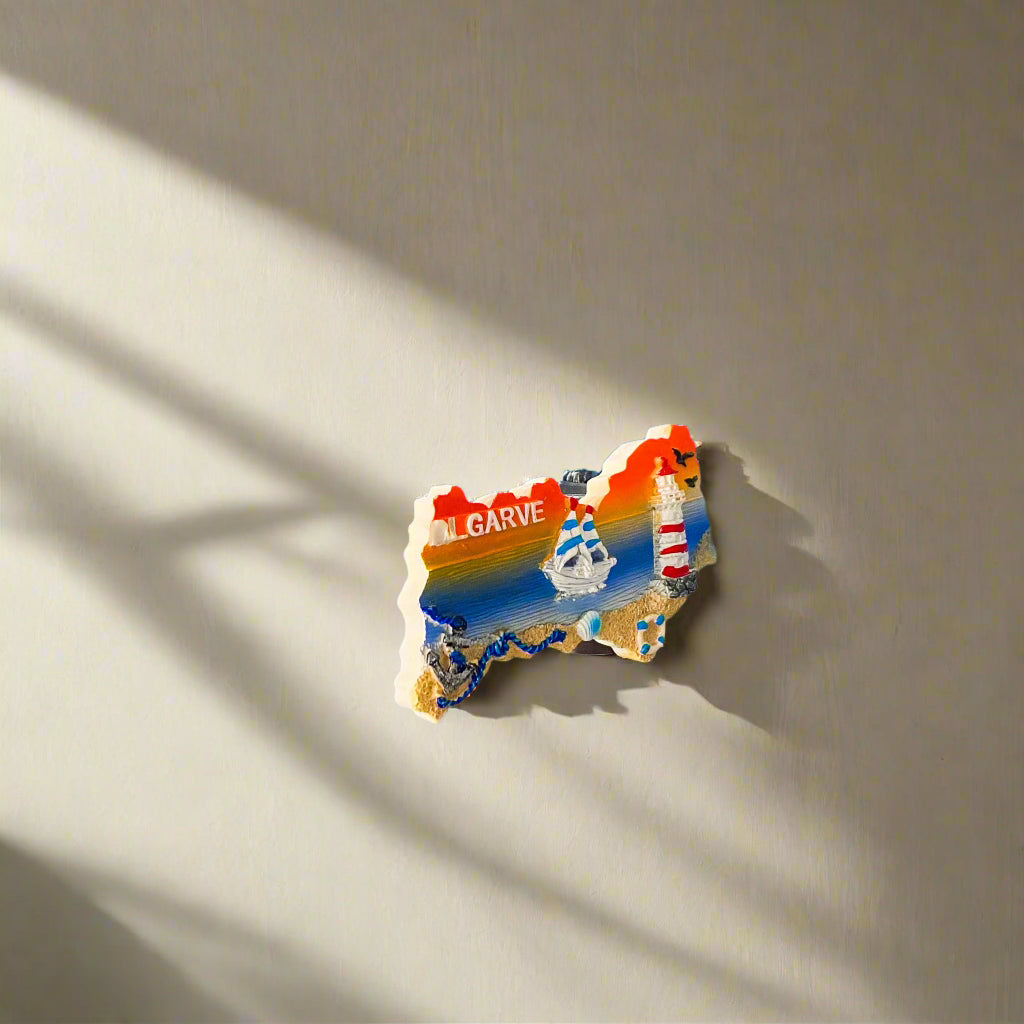 Feiern Sie die Schönheit der Algarve mit diesem Magnet-Set aus zwei kunstvoll gestalteten Souvenirs – jeweils in Form der Regionalkarte und verziert mit maritimen Details. Einer der Magnete zeigt die Algarve in strahlendem Tageslicht, der andere in den warmen Farben eines Sonnenuntergangs. Beide fangen die gleiche Küstenlandschaft ein: das ruhige Meer, ein Segelboot, ein rot-weiß gestreifter Leuchtturm, Anker, Seesterne, Muscheln und ein goldfarbener Sandstreifen.