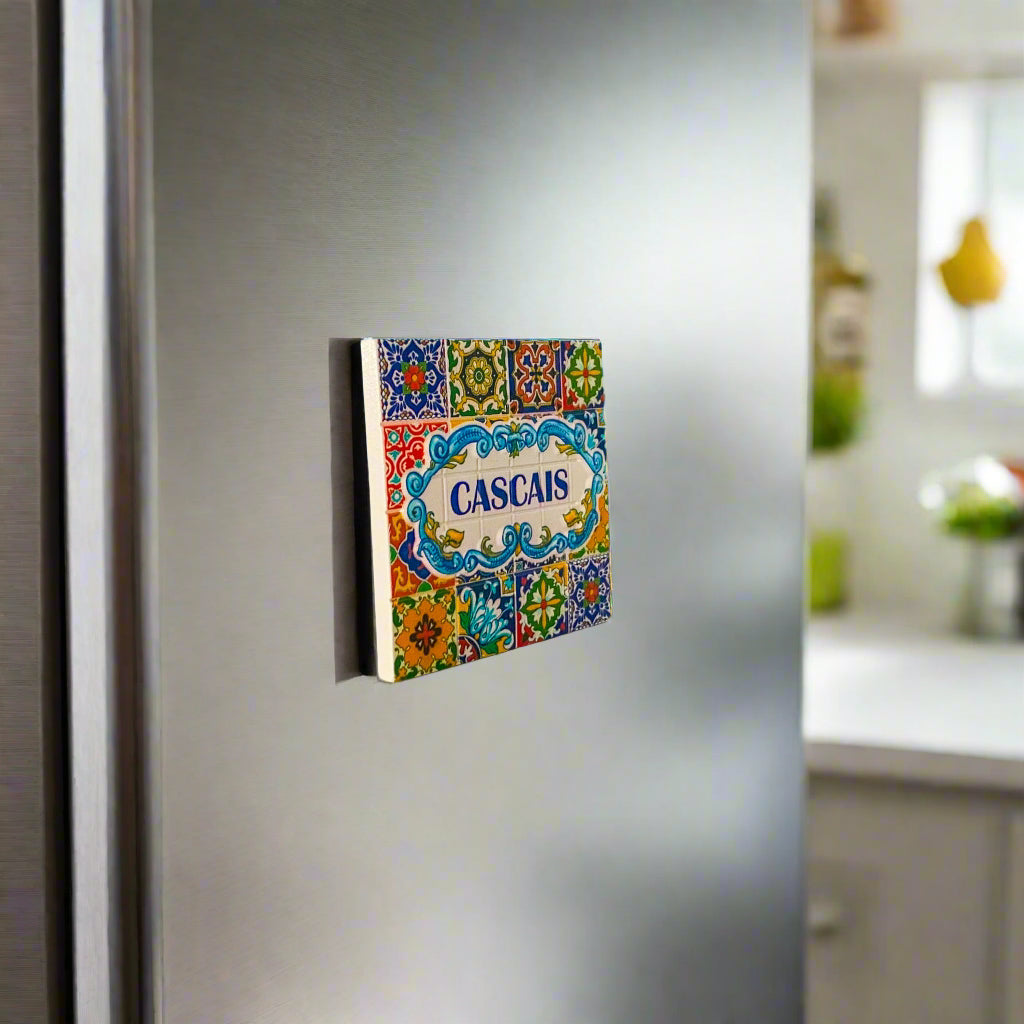 Dieser Cascais-Kühlschrankmagnet bringt die Eleganz der portugiesischen Küste in kompaktem Format zur Geltung. Kunstvoll gestaltet, spiegelt er die Tradition portugiesischer Fliesenkunst wider. Ein lebendiges Patchwork aus detaillierten Azulejo-Motiven und der Schriftzug Cascais, eingefasst in einen verzierten Rahmen, machen dieses Andenken zu einem dekorativen Vermächtnis portugiesischer Kultur.