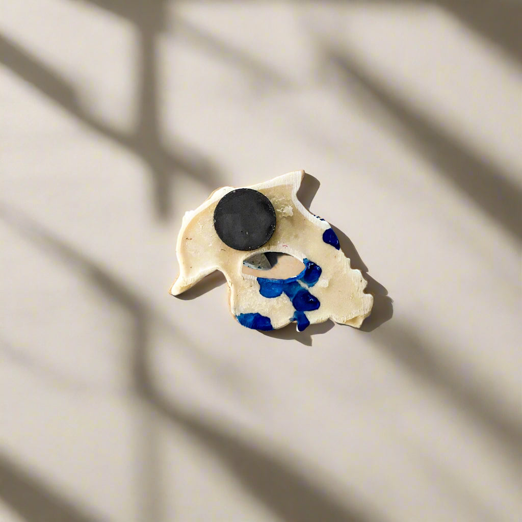 Im Mittelpunkt des Designs steht ein anmutiger blauer Delfin, Symbol für Intelligenz, Freiheit und die Meeresfauna, die häufig entlang der Küste dieser charmanten Küstenstadt zu sehen ist. Der Körper des Delfins windet sich zu einem Ring, der einem Rettungsring ähnelt, mit dem Namen „Cascais“, der in kräftigem Rot geschrieben ist. Ein Miniatur-weiß-roter Rettungsring, ein goldener Seestern und Muscheldetails verleihen dem Stück zusätzlichen Charakter und visuelle Tiefe.