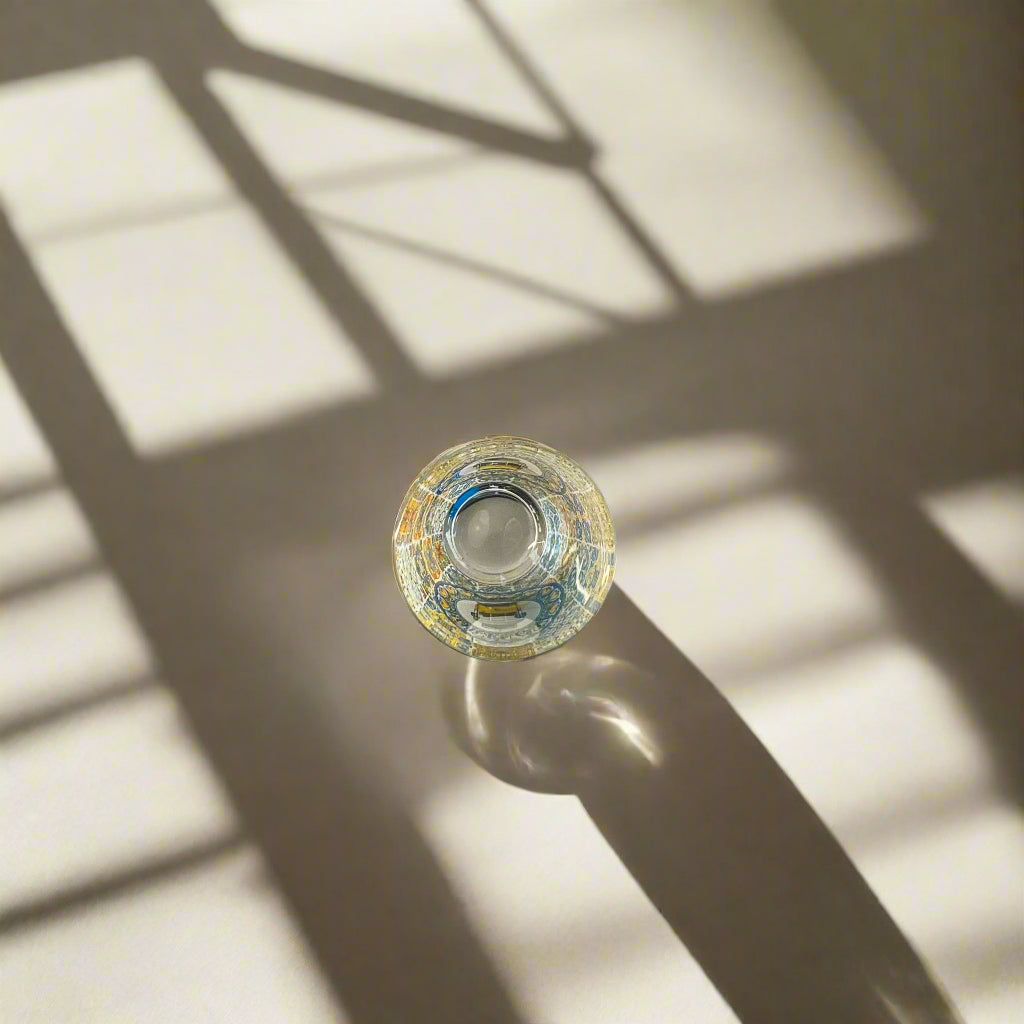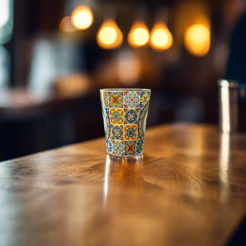 Les azulejos, introduits au Portugal à l'époque mauresque, sont devenus l'un des éléments les plus caractéristiques de la culture visuelle du pays. À Lisbonne, ils sont omniprésents : ils ornent façades, fontaines et stations de métro. Leurs motifs complexes et leurs couleurs vives sont magnifiquement représentés sur ce verre à liqueur, qui en fait une œuvre d'art miniature à part entière.
