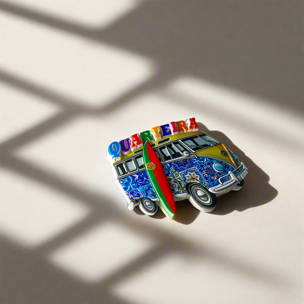 Ce qui rend cet aimant si spécial, c'est sa fusion entre tradition portugaise et culture surf . La surface du van est recouverte d' azulejos, des motifs de carreaux ornés, peints à la main, rappelant l'art céramique historique qui orne les bâtiments de la région. Sur le côté, une planche de surf colorée, verte et rouge , symbolise la fierté nationale du Portugal et son lien avec l'Atlantique.