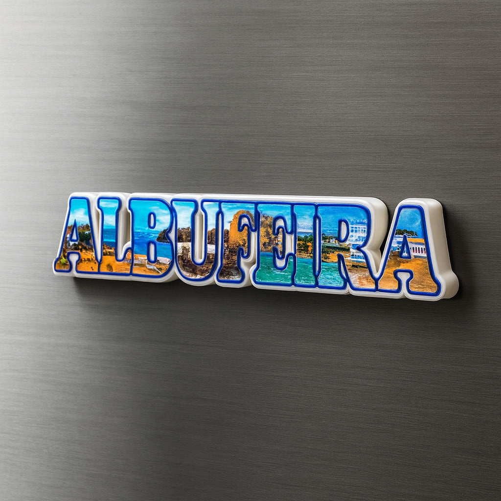 Rapportez chez vous une tranche de votre escapade en bord de mer avec cet aimant souvenir d'Albufeira , comportant le nom de la ville en lettres audacieuses et remplies de photos qui mettent en valeur le meilleur des paysages côtiers de l'Algarve .