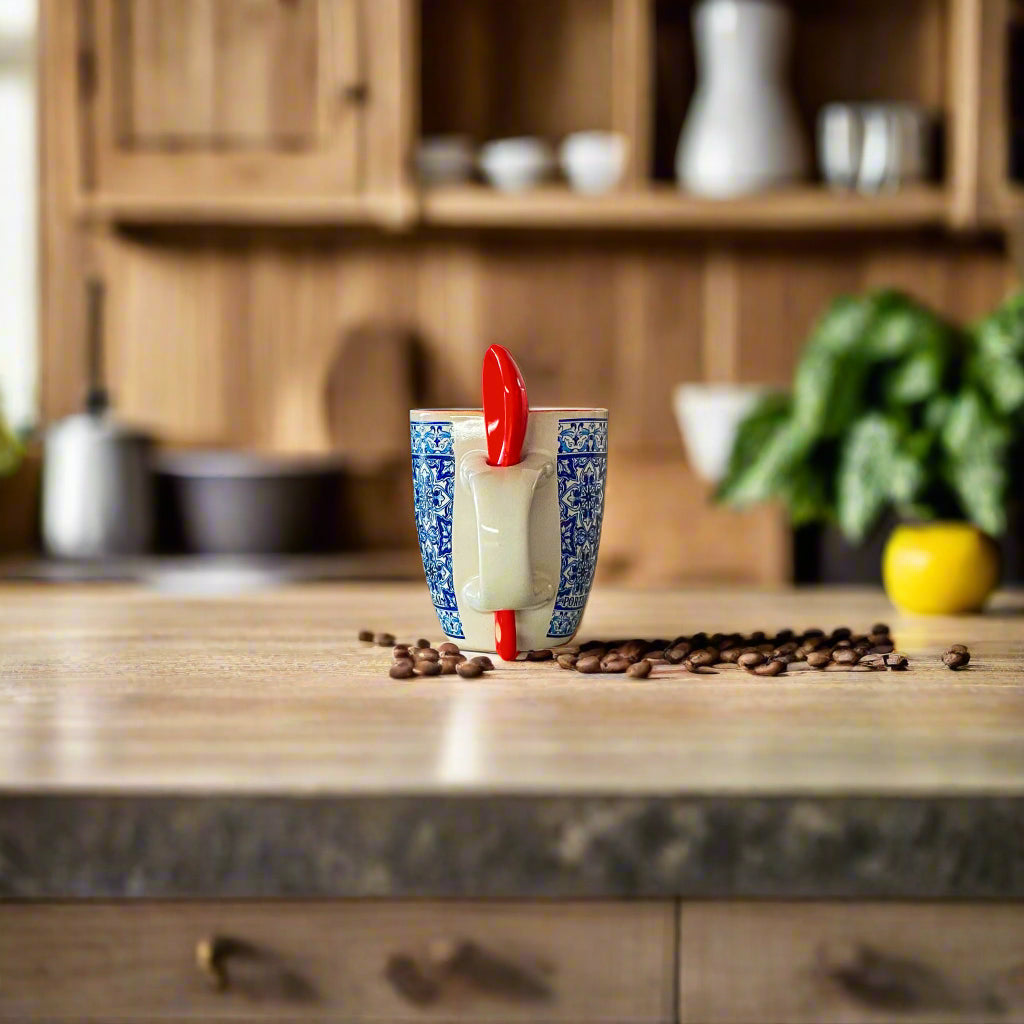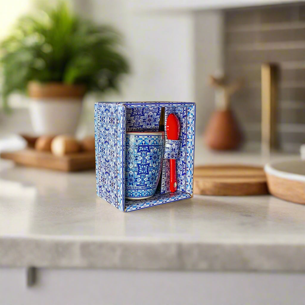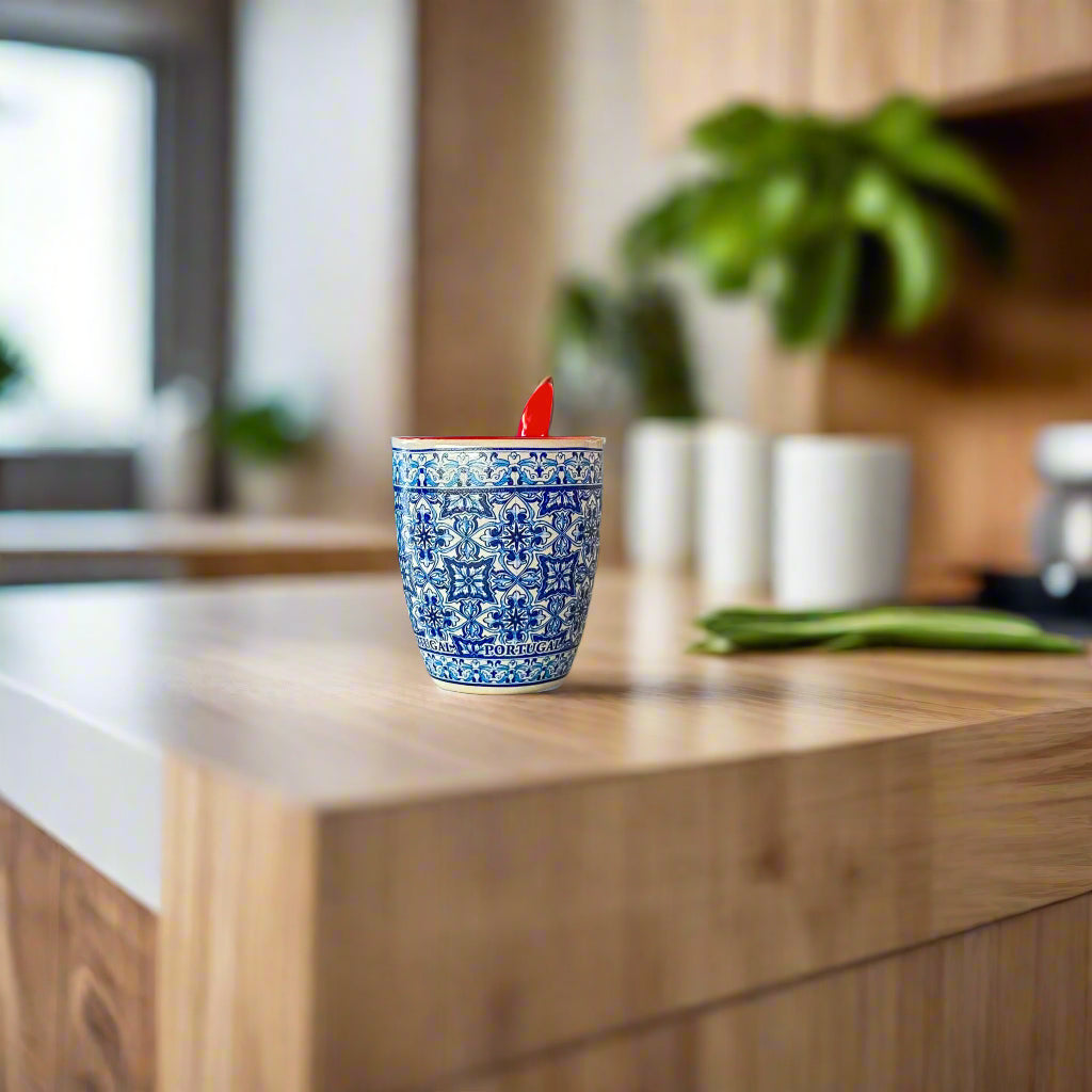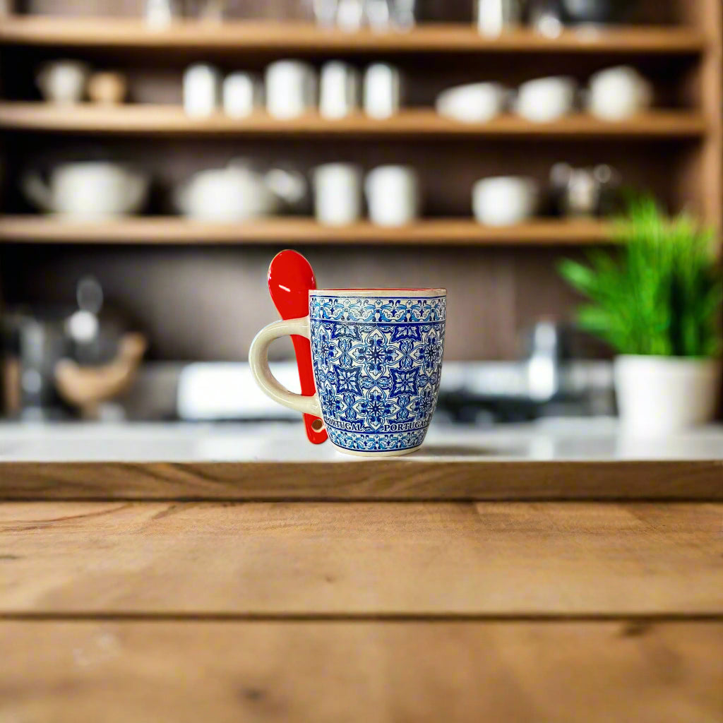 Delicadamente desenhada e rica em herança, esta chávena de café expresso em cerâmica é uma homenagem refinada à tradição portuguesa dos azulejos. Com um clássico padrão azul e branco que envolve todo o corpo da chávena, esta peça capta a elegância do artesanato português num formato compacto e funcional. Inclui uma colher em cerâmica vermelha vibrante, encaixada no cabo da chávena, e é apresentada numa caixa de oferta decorativa, tornando-se a recordação perfeita para amantes de café e entusiastas da cultura portuguesa.