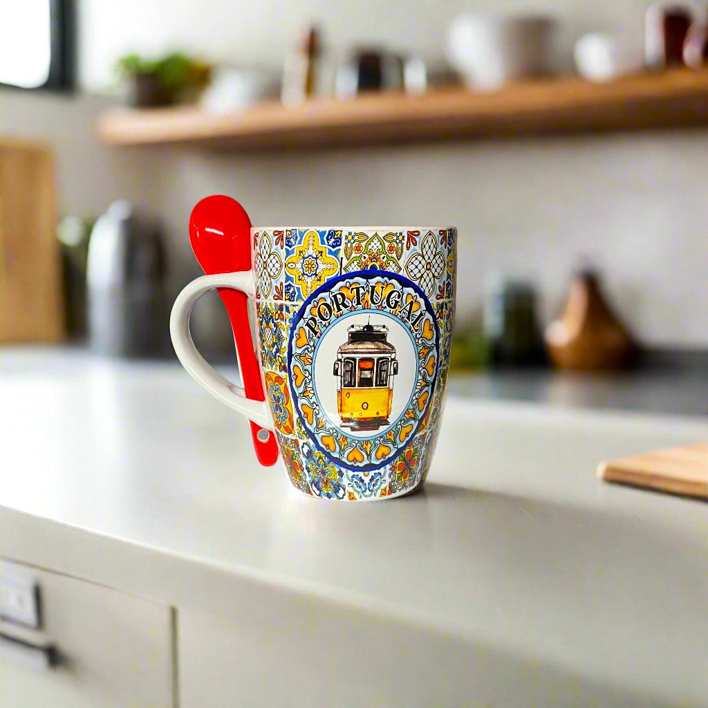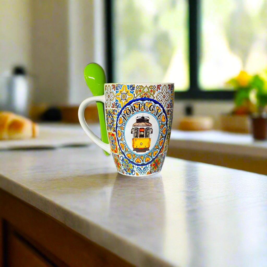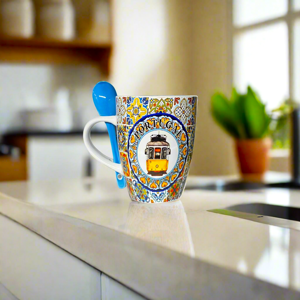 Caneca de Souvenir em Cerâmica de Portugal com Ilustração do Eléctrico, Motivos de Azulejos e Colher