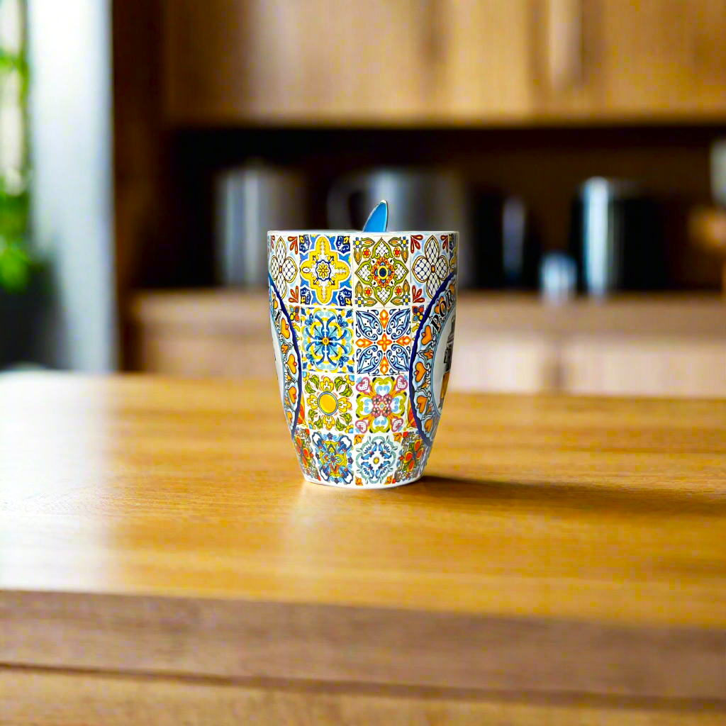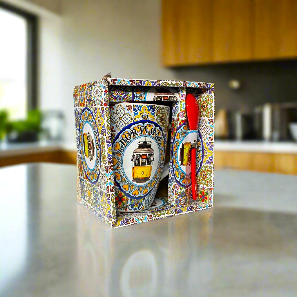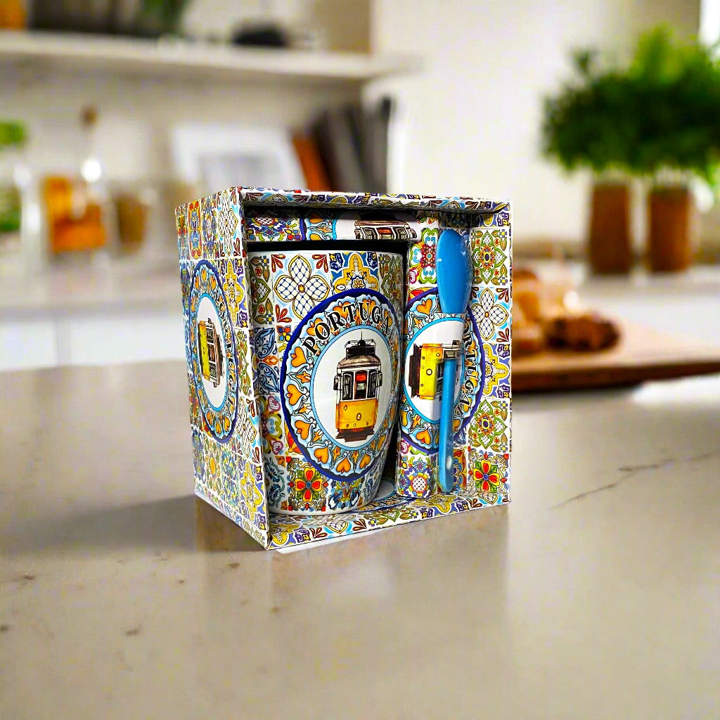 Caneca de Souvenir em Cerâmica de Portugal com Ilustração do Eléctrico, Motivos de Azulejos e Colher