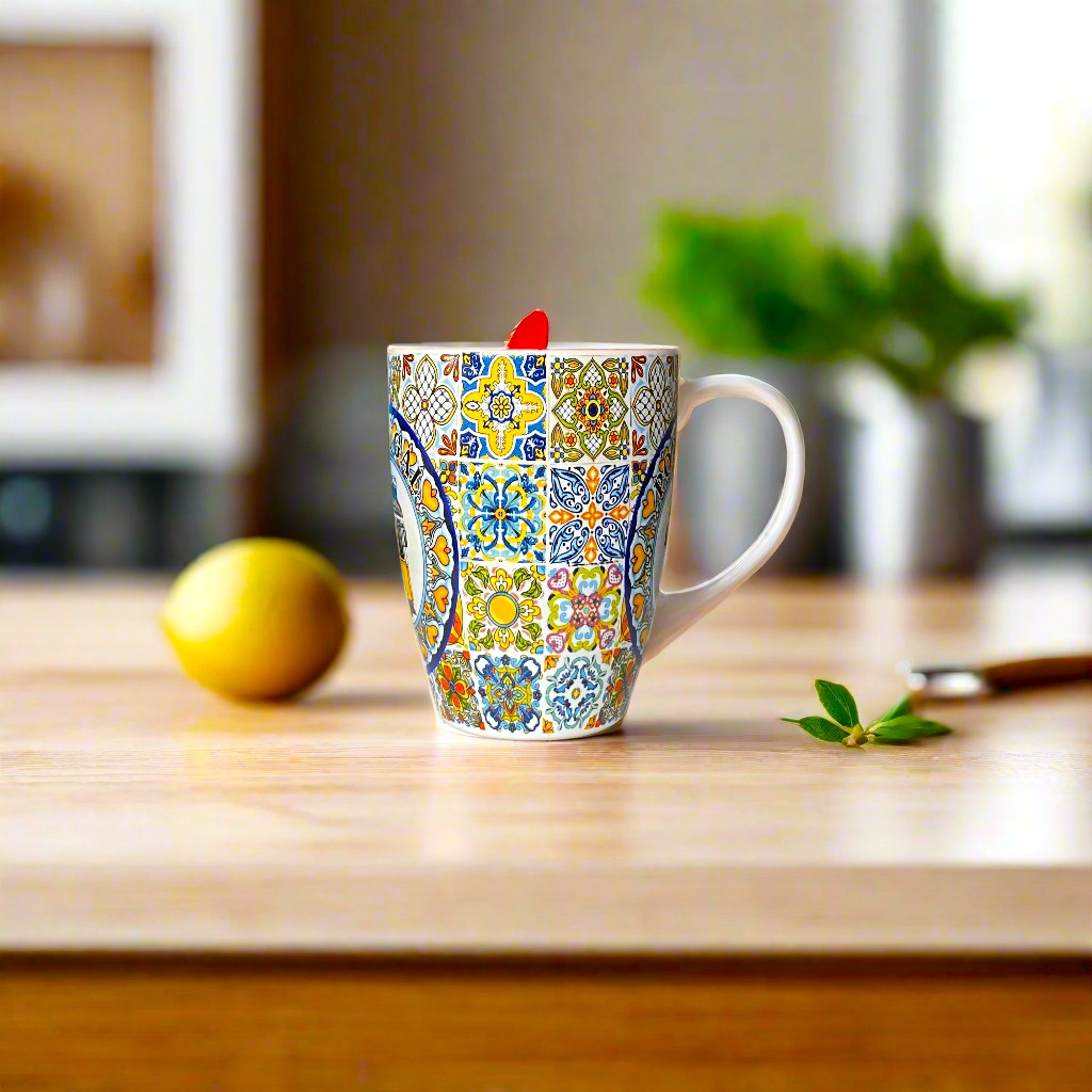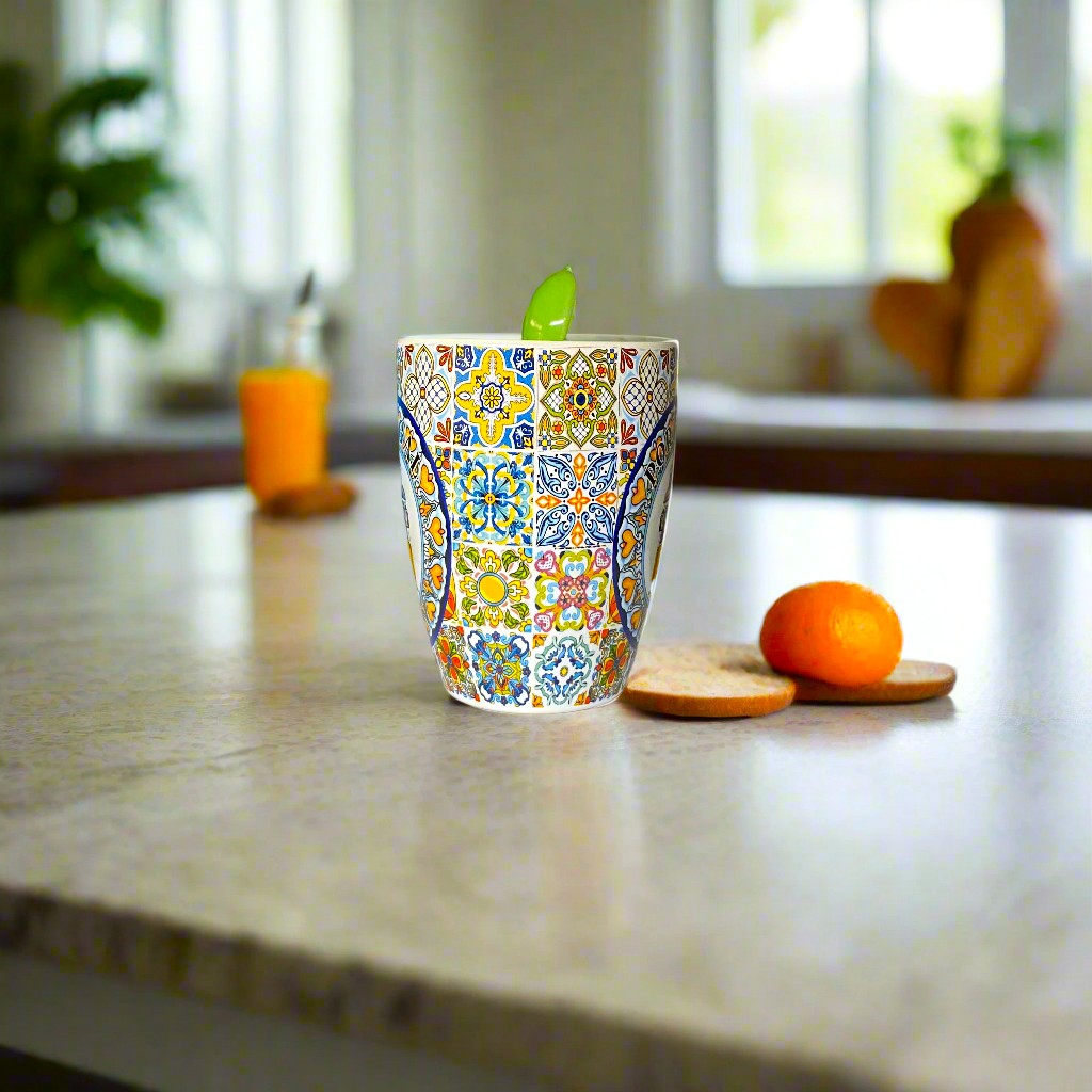 Celebre o património cultural português com esta caneca de souvenir em cerâmica de Portugal, uma peça vibrante que conjuga de forma exemplar o artesanato tradicional com um simbolismo nacional reconhecível. Produzida em cerâmica de elevada qualidade, apresenta-se como uma peça resistente, funcional e apropriada para utilização quotidiana. O design distinto destaca uma ilustração detalhada do icónico elétrico amarelo, um dos símbolos culturais mais emblemáticos de Portugal, envolto por padrões coloridos inspirados nos tradicionais azulejos portugueses. O conjunto é complementado por uma colher em cerâmica de destaque, elegantemente encaixada na pega — ideal para mexer café ou chá.